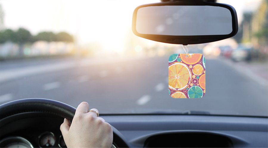 Aromatická visačka do auta na zakázku s výběrem z 9 tvarů a z 8 vůní (exotické, zelené jablko, citron, nové auto, oceán, vanilka, luxus, mentol). Potištěno až 4 barvami na každé straně. Zcela vlastní tvar je možný za příplatek. Min. mn.: 250 ks.