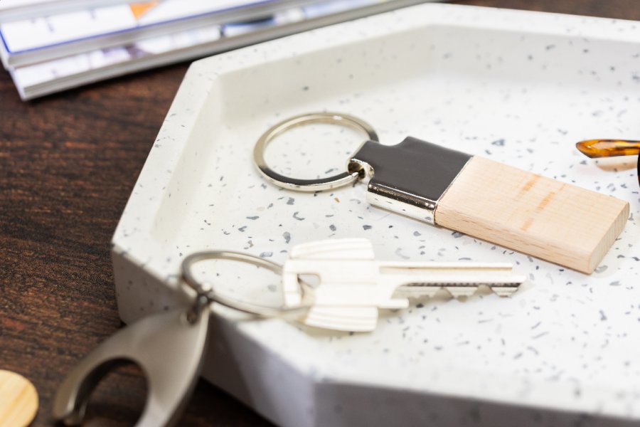 Přívěšek na klíče ve tvaru obdélníku z kovu a bukového dřeva s kovovým kroužkem.
