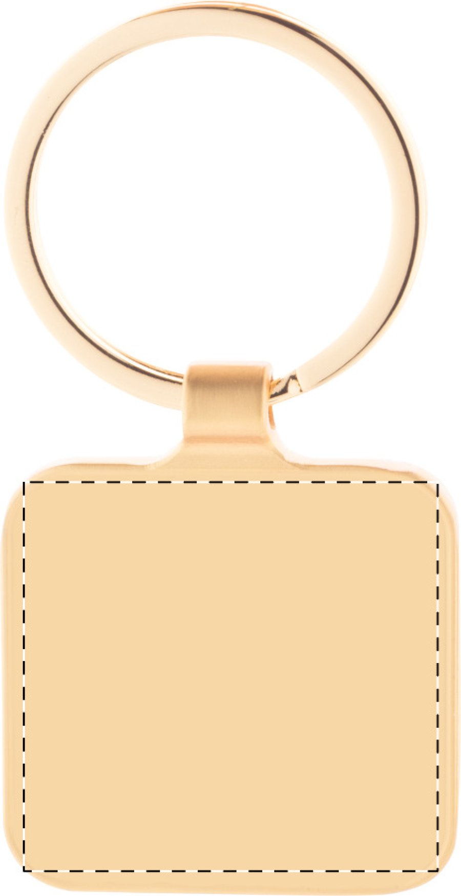 Kovový přívěsek na klíče čtvercového tvaru ve zlatém provedení s bronzovou destičkou. V kraftové papírové krabici.