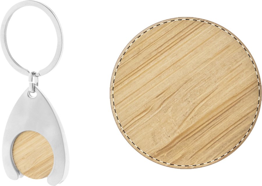 Kovový přívěsek na klíče s mincí ve tvaru bambusového nákupního vozíku a kovovým kroužkem. Velikost mince: ø23×2 mm.