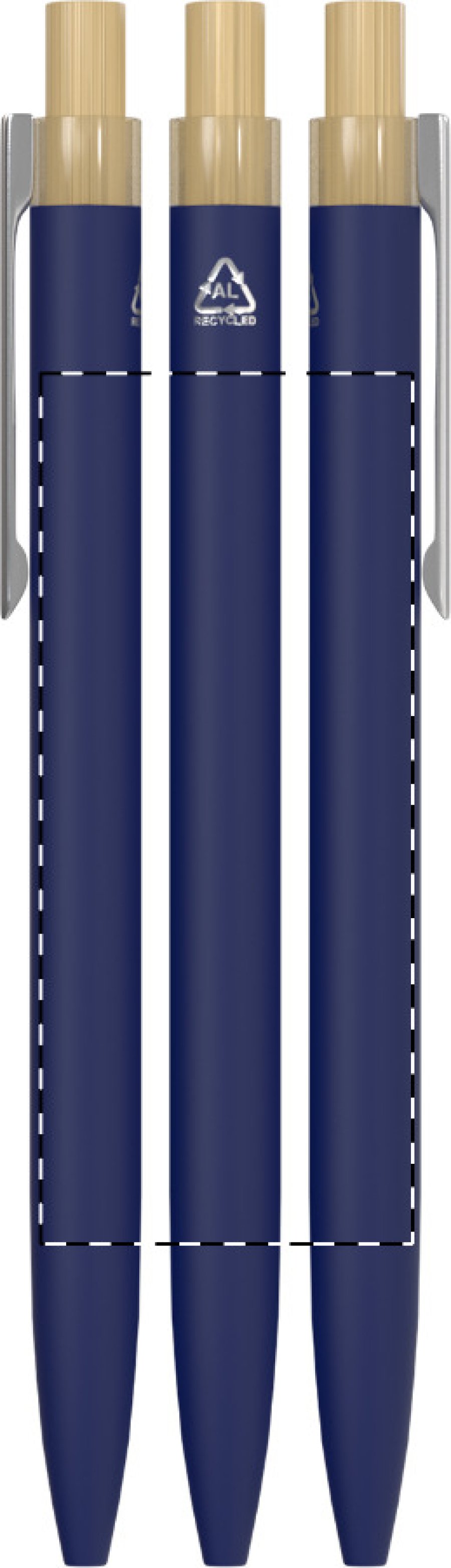 Kuličkové pero z recyklovaného hliníku s pogumovaným povrchem, bambusovým tlačítkem a chromovým klipem. Se speciální vrstvou pro zrcadlové laserové gravírování. S modrou náplní.