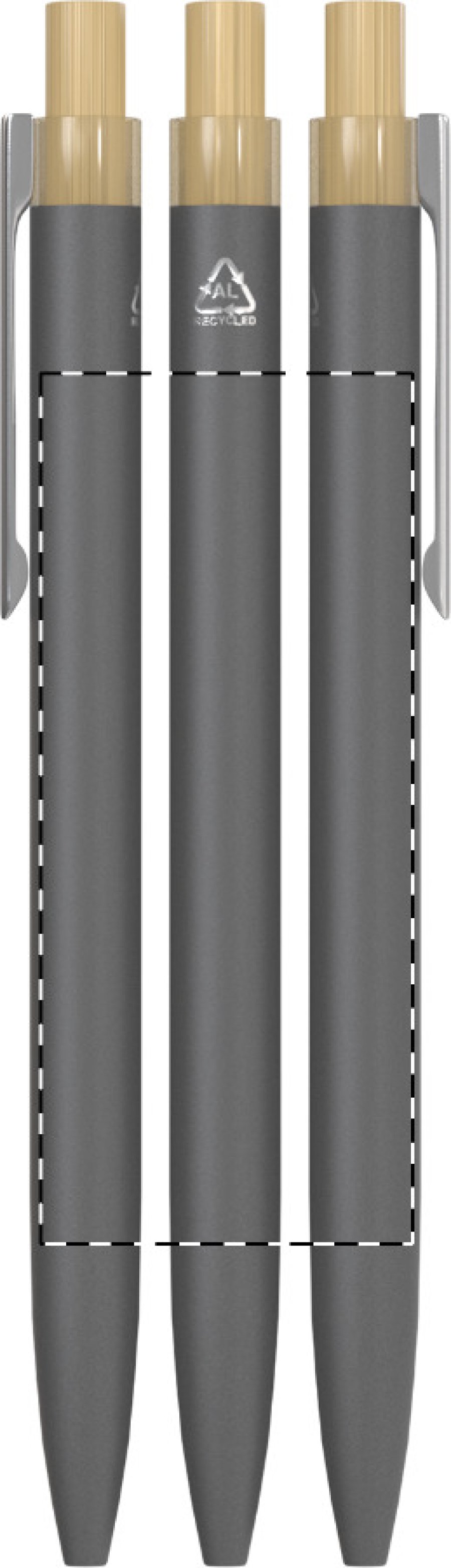 Kuličkové pero z recyklovaného hliníku s pogumovaným povrchem, bambusovým tlačítkem a chromovým klipem. Se speciální vrstvou pro zrcadlové laserové gravírování. S modrou náplní.