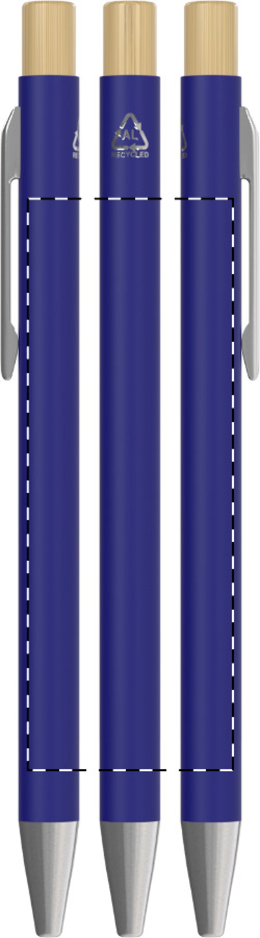 Kuličkové pero z recyklovaného hliníku s pogumovaným povrchem a bambusovým tlačítkem a chromovými detaily. Se speciální vrstvou pro zrcadlové laserové gravírování. S modrou náplní.