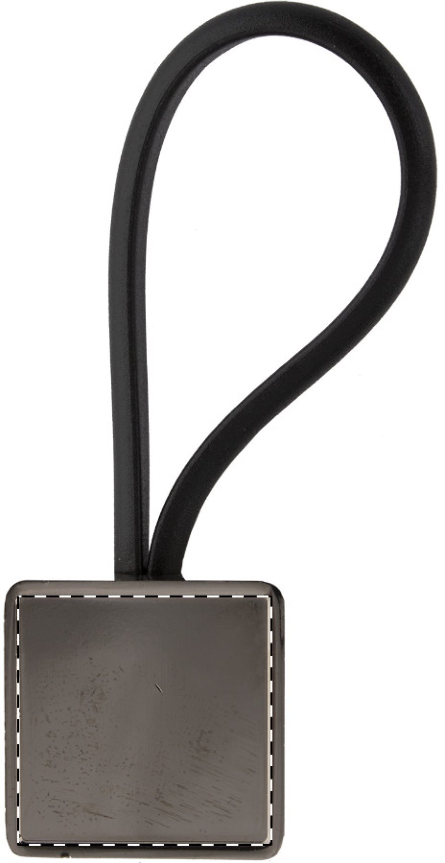 Čtvercový přívěšek na klíče s černým gumovým poutkem s epoxy potiskem.