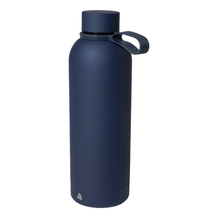 Dvoustěnná vakuová láhev z recyklované nerezové oceli s pogumovanou úpravou a silikonovým páskem, 500 ml.