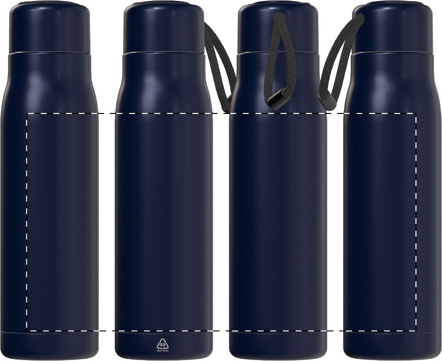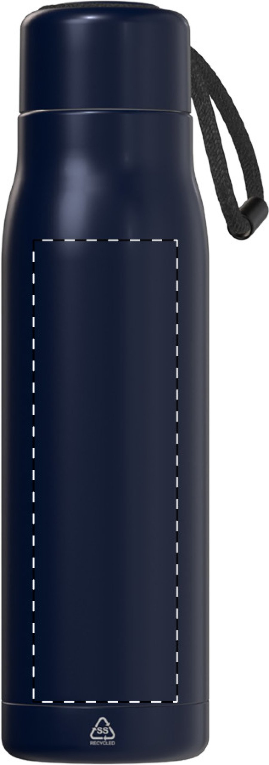 Dvoustěnná, vakuově izolovaná láhev z recyklované nerezové oceli s PP víčkem a integrovaným poutkem na nošení se šňůrkou. 500 ml.