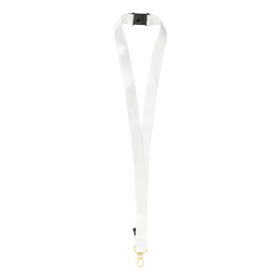 Lanyard na zakázku z RPET s barevnou kovovou karabinou a bezpečnostní sponou. S oboustranně potištěnou grafikou, cena nezahrnuje tiskovou přípravu. Min. mn.: 100 ks.
