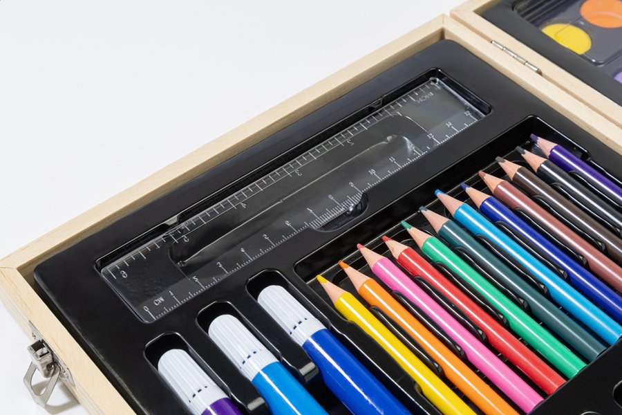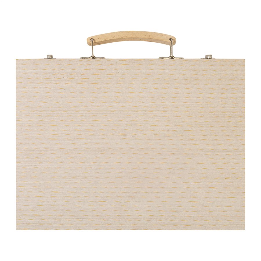 Komplexní 66dílná sada pro kreslení a vybarvování v dřevěné přepravní krabičce. Obsahuje: 12 voskovek, 12 olejových pastelů, 12 tužek, 12 fixů, 12 akvarelových barev s paletou a štětcem, pravítko, gumu, ořezávátko a lepidlo.