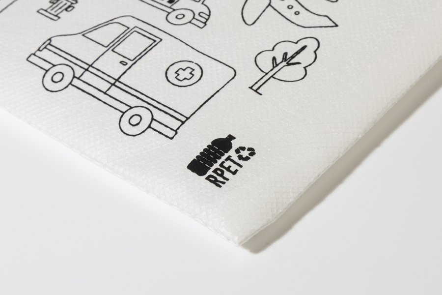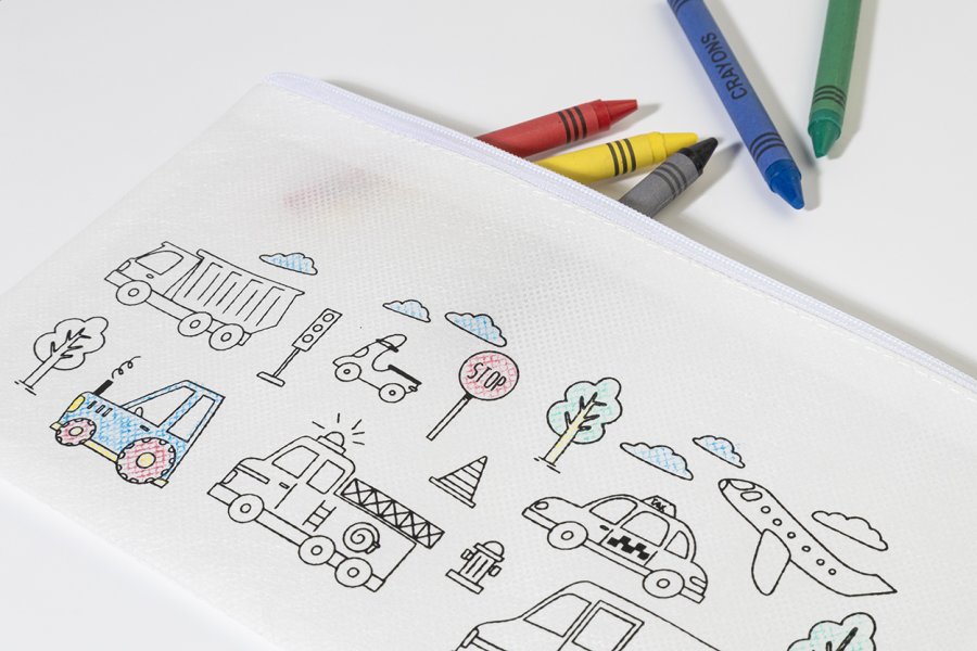Pouzdro na pera se zipem z netkané RPET tkaniny s 5 voskovkami na vybarvení.