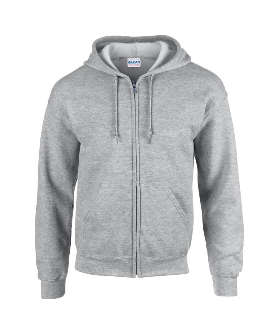 Mikina 50% bavlna / 50% polyester s kapucí, kovovým zipem a předními kapsami, 271 g/m² (bílá 257 g/m²). Produkt značky Gildan.