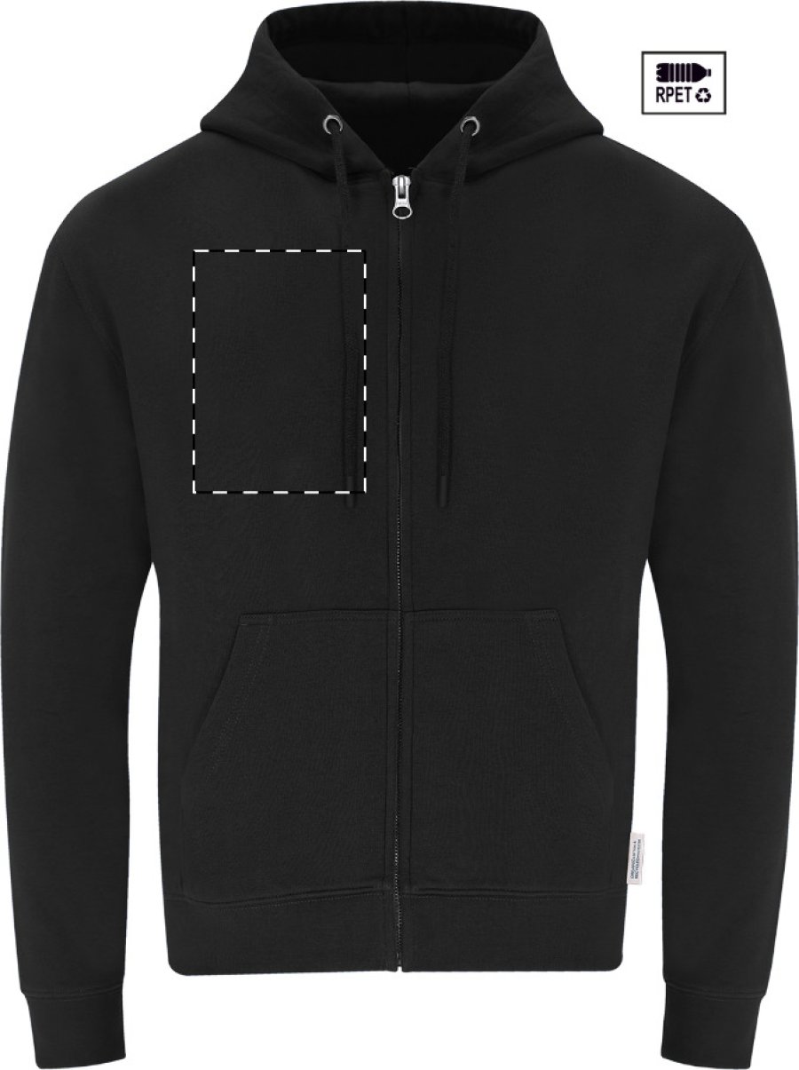 Mikina s kapucí na zip a předními kapsami ze 60% organické bavlny a 40% RPET polyesteru, 280 g/m2.