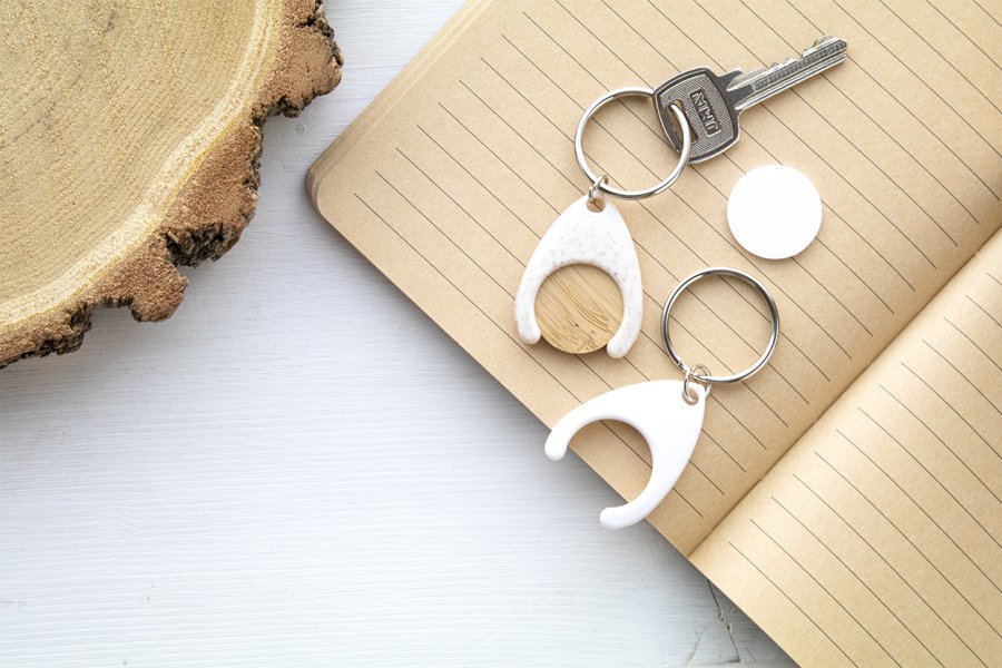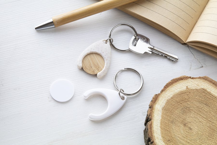 Bambusový žeton do nákupního vozíku v ekologické plastové klíčence z pšeničné slámy.