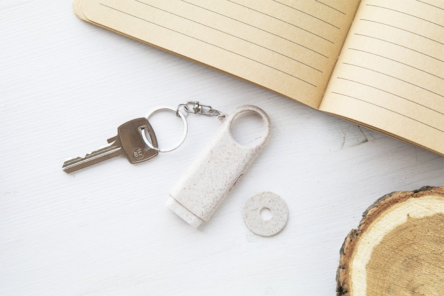 Přívěšek na klíče z ekologického plastu ze slámy se žetonem do vozíku a 2 LED světly. Do dáváno se 2 knoflíkovými bateriemi.