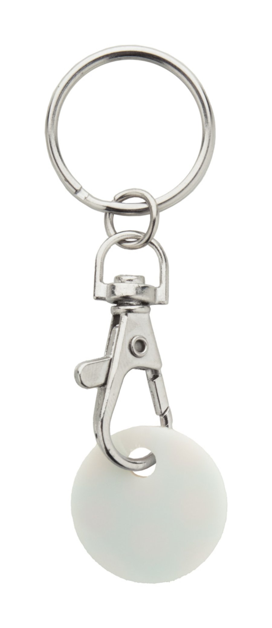 Kovový přívěsek na klíče s karabinou s celobarevně potištěným plastovým žetonem do nákupního vozíku. Cena je včetně UV LED tisku na jedné straně, nezahrnuje tiskovou přípravu. Velikost žetonu: ø23×2 mm. Min. mn.: 200 ks.