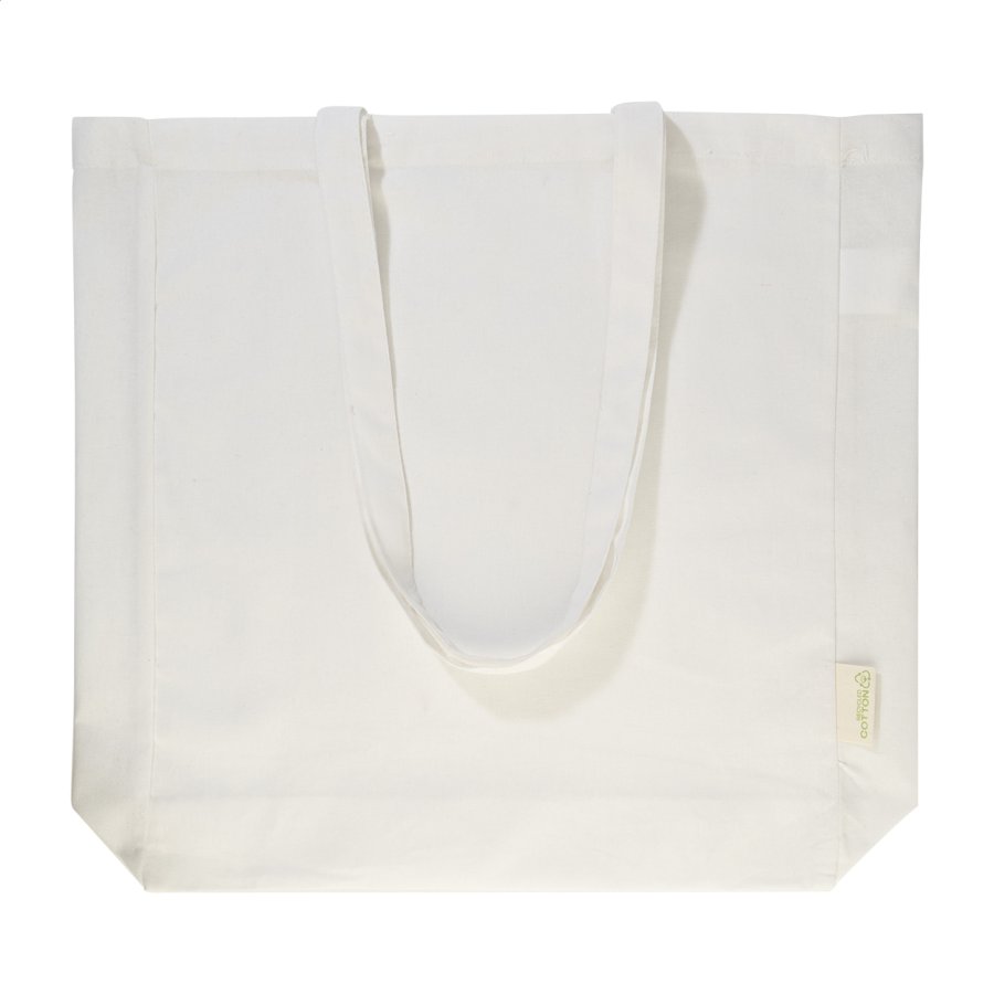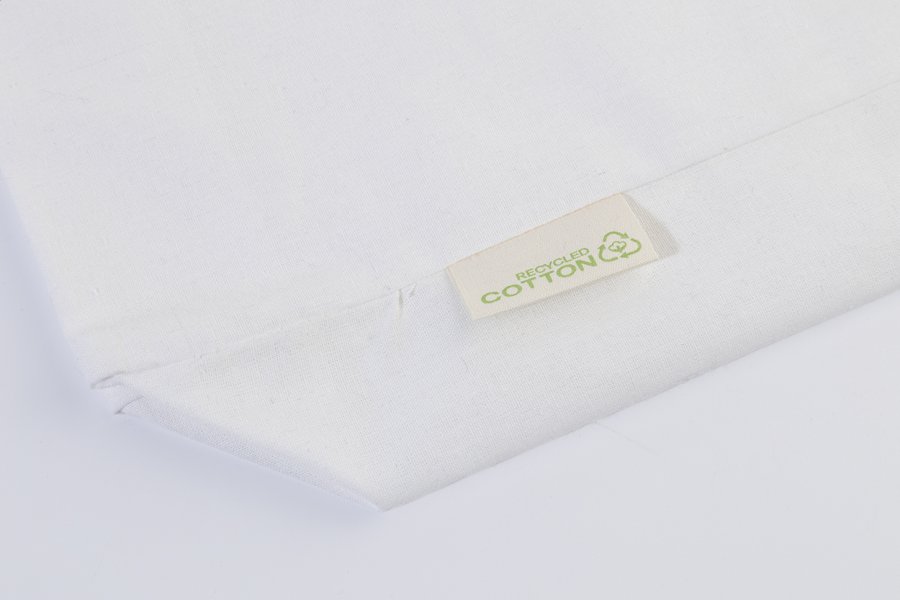 Nákupní taška s klínkem a dlouhými uchy ze 70 % recyklované bavlny a 30 % RPET polyesteru, 140 g/m². S výraznou etiketou o recyklované bavlně.