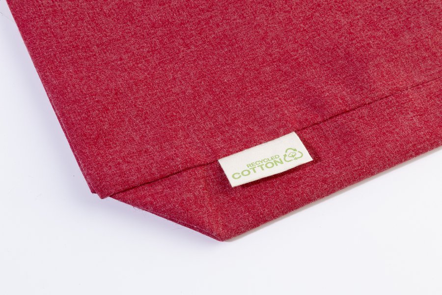 Nákupní taška s klínkem a dlouhými uchy ze 70 % recyklované bavlny a 30 % RPET polyesteru, 140 g/m². S výraznou etiketou o recyklované bavlně.