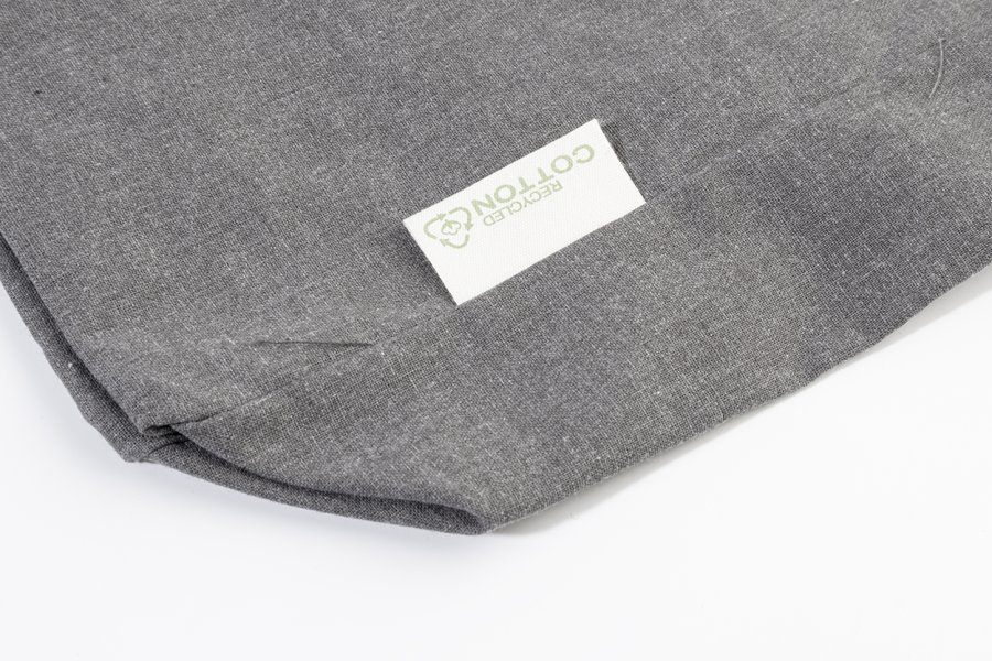 Nákupní taška s klínkem a dlouhými uchy ze 70 % recyklované bavlny a 30 % RPET polyesteru, 140 g/m². S výraznou etiketou o recyklované bavlně.