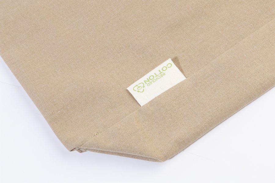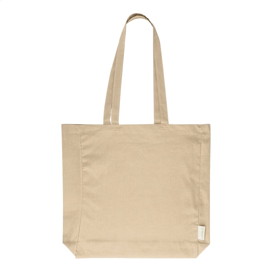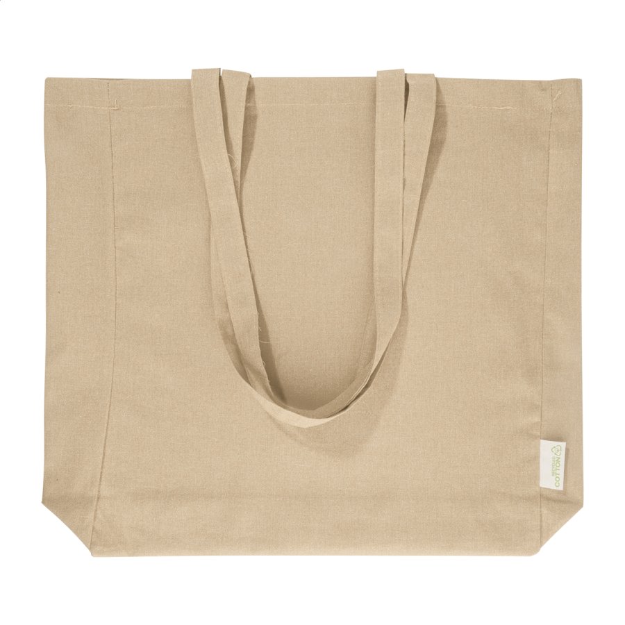 Nákupní taška s klínkem a dlouhými uchy ze 70 % recyklované bavlny a 30 % RPET polyesteru, 140 g/m². S výraznou etiketou o recyklované bavlně.