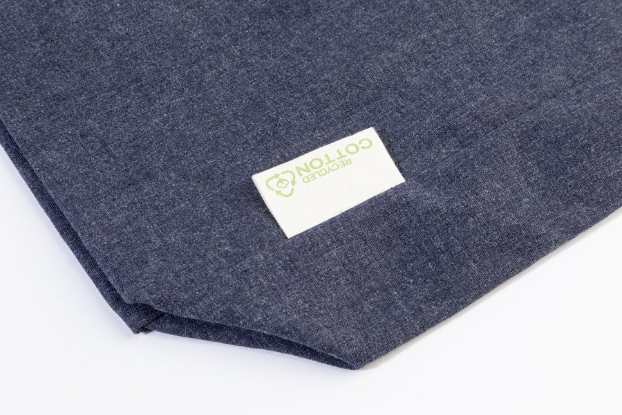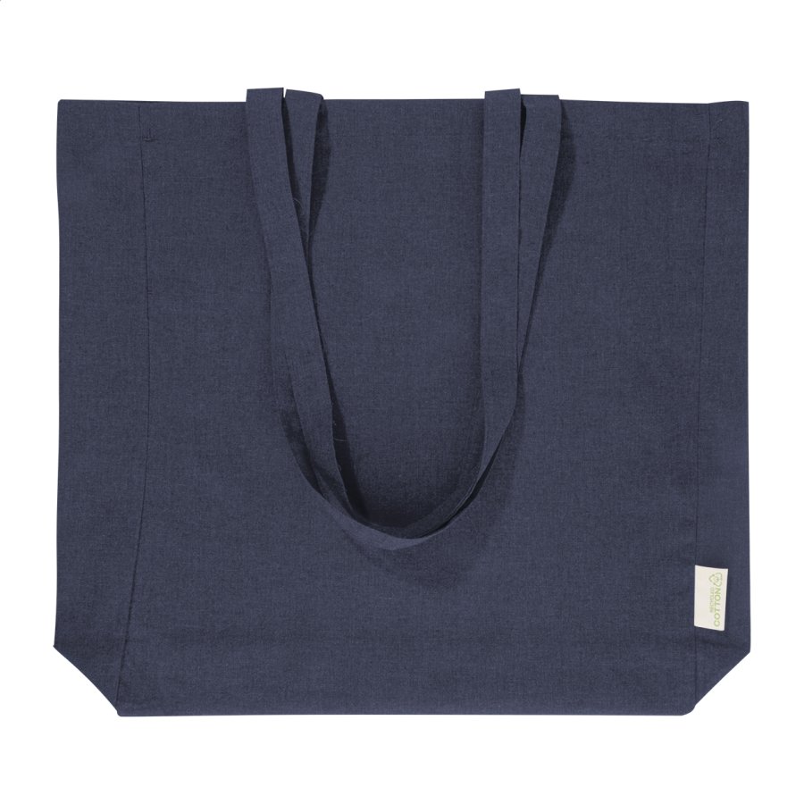 Nákupní taška s klínkem a dlouhými uchy ze 70 % recyklované bavlny a 30 % RPET polyesteru, 140 g/m². S výraznou etiketou o recyklované bavlně.