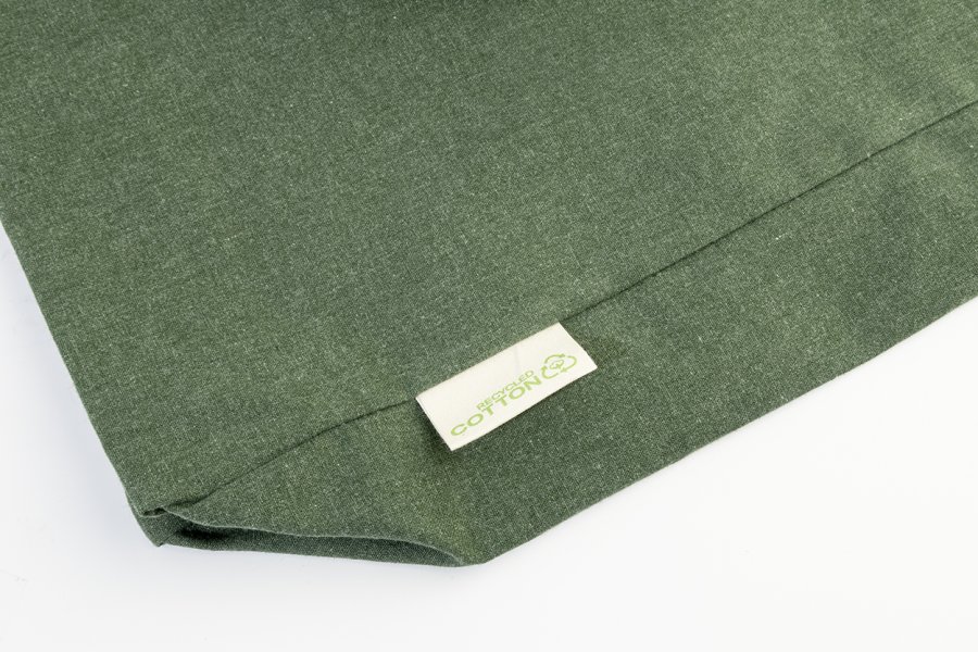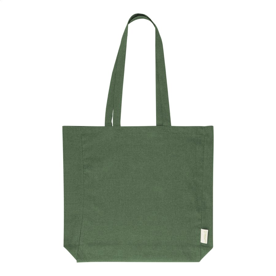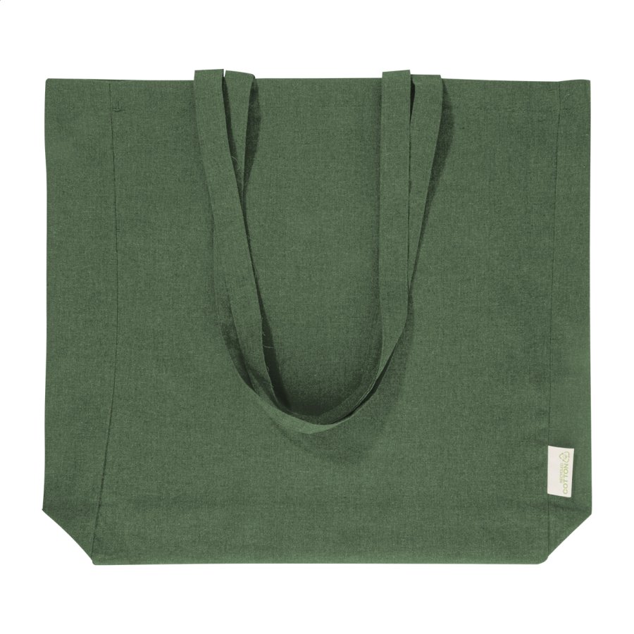 Nákupní taška s klínkem a dlouhými uchy ze 70 % recyklované bavlny a 30 % RPET polyesteru, 140 g/m². S výraznou etiketou o recyklované bavlně.