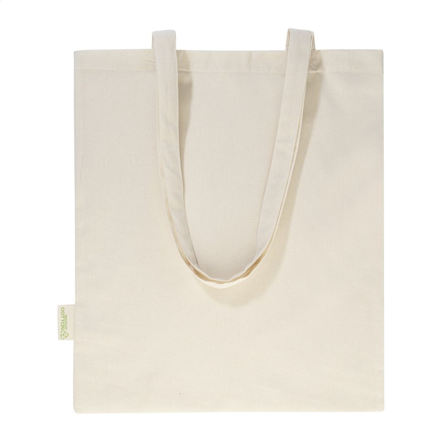 Nákupní taška s dlouhými uchy ze 70 % recyklované bavlny a 30 % RPET polyesteru, 140 g/m². S výraznou etiketou orecyklované bavlně.