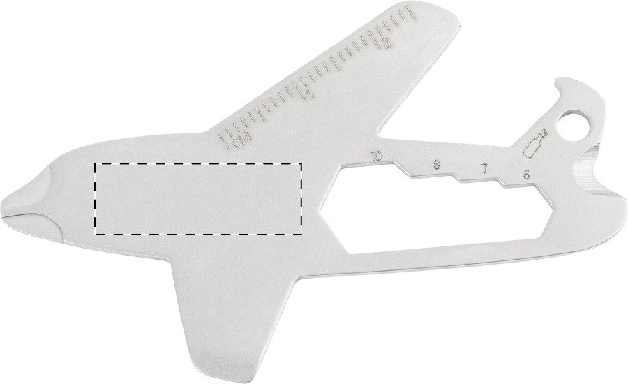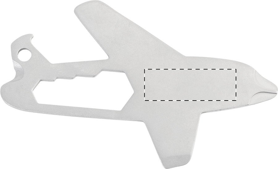 Přívěsek na klíče s multifunkčním nástrojem ve tvaru letadla z recyklované nerezové oceli s otvírákem na lahve, pravítkem, křížovým a plochým šroubovákem, imbusovým klíčem a štípačkou na drát.