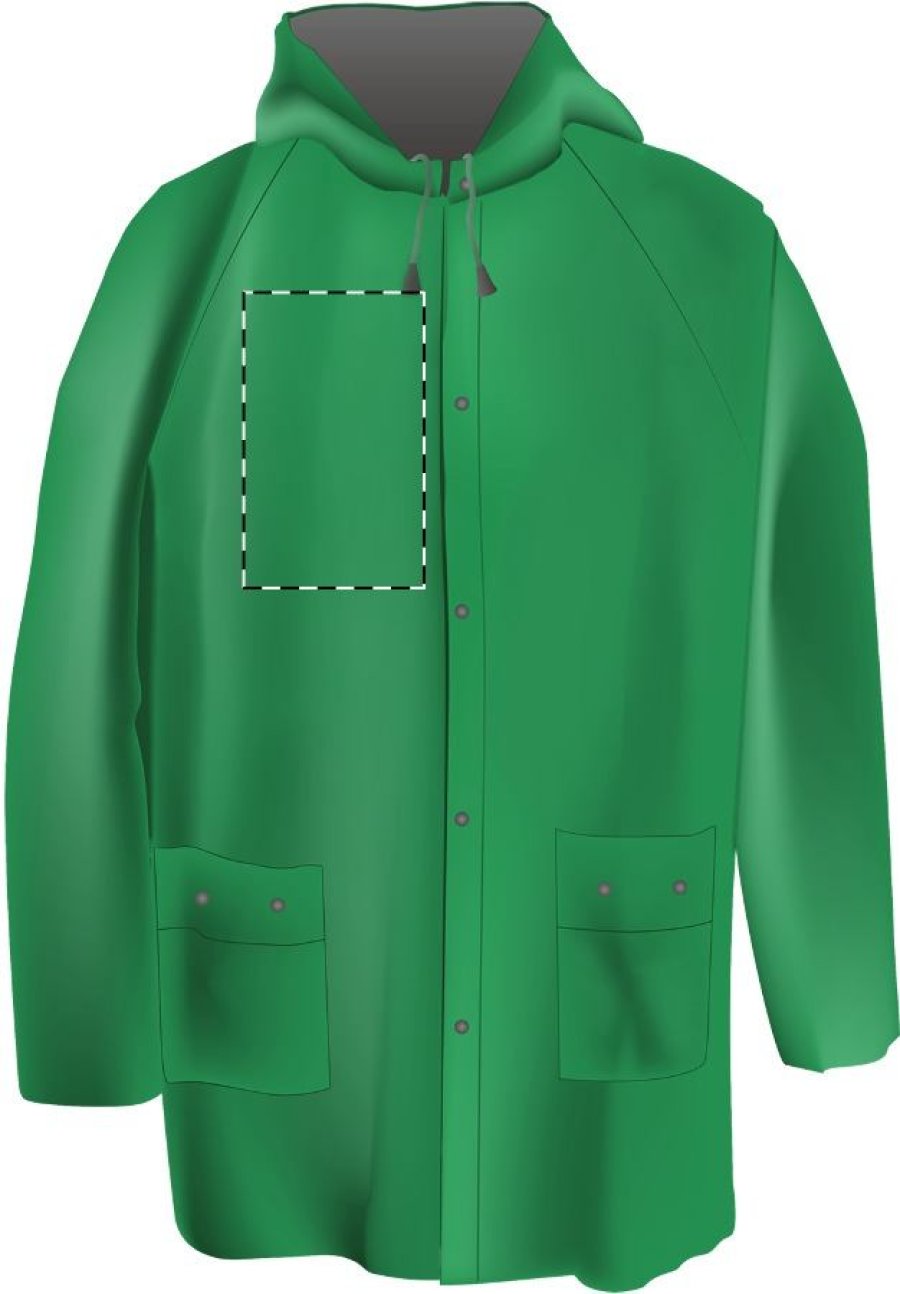 Pláštěnka s kapucí z odolného PVC s žáruvzdornou povrchovou úpravou. Se zapínáním na knoflíky a dvěma předními kapsami.