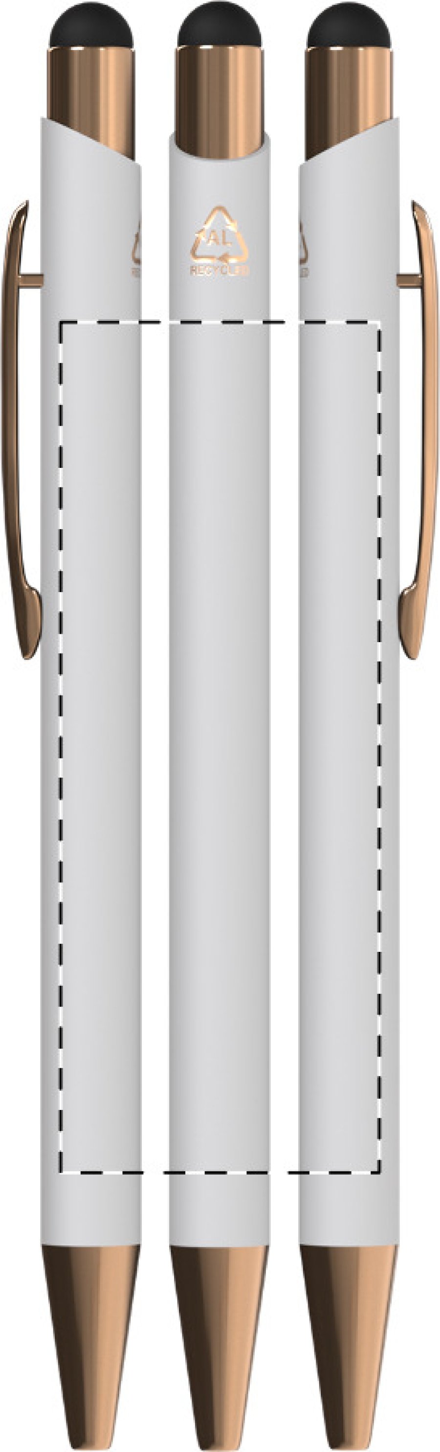 Kuličkové a dotykové pero z recyklovaného hliníku s pogumovaným povrchem a detaily v barvě růžového zlata. Se speciální povrchovou úpravou pro zrcadlové laserové gravírování v barvě růžového zlata. S modrou náplní.