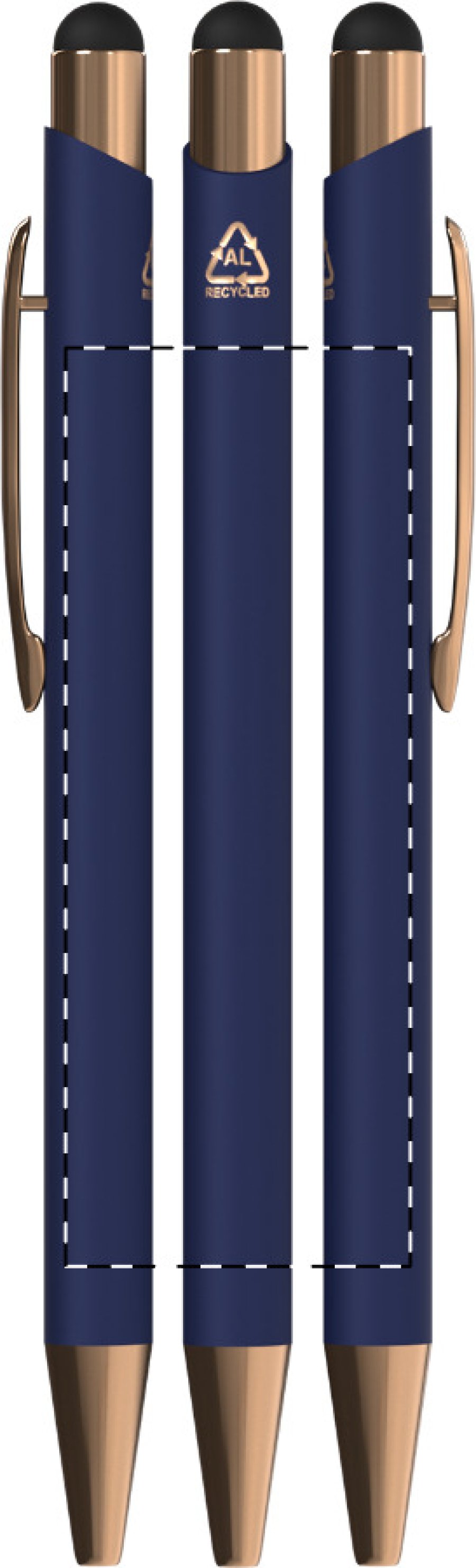 Kuličkové a dotykové pero z recyklovaného hliníku s pogumovaným povrchem a detaily v barvě růžového zlata. Se speciální povrchovou úpravou pro zrcadlové laserové gravírování v barvě růžového zlata. S modrou náplní.