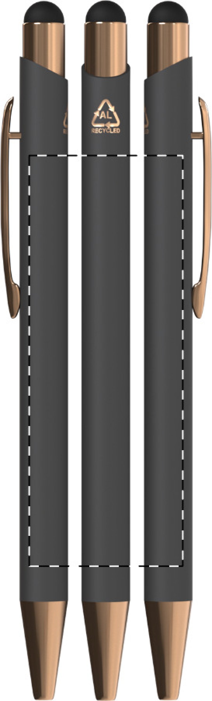 Kuličkové a dotykové pero z recyklovaného hliníku s pogumovaným povrchem a detaily v barvě růžového zlata. Se speciální povrchovou úpravou pro zrcadlové laserové gravírování v barvě růžového zlata. S modrou náplní.
