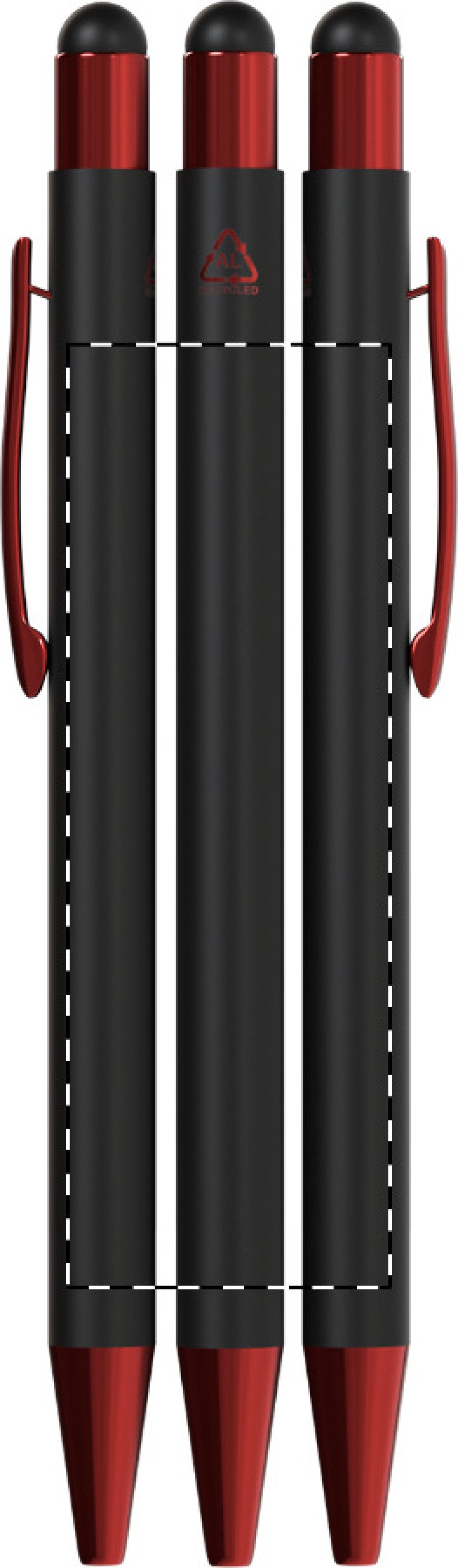 Kuličkové pero z recyklovaného hliníku na dotykovou obrazovku, s černým pogumovaným tělem a barevnými lesklými kovovými částmi. Se speciálním povrchem pro zrcadlové gravírování, které ladí s kovovými částmi. S modrou náplní.