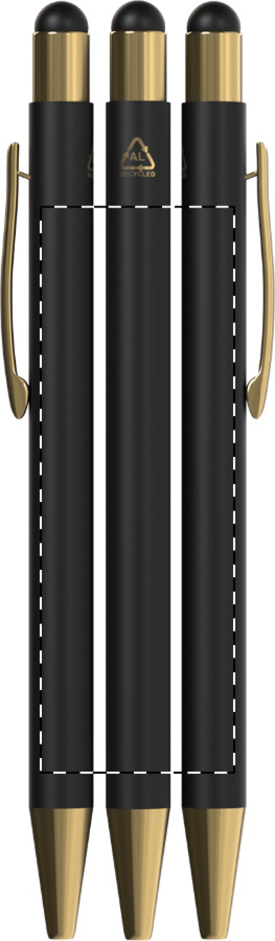 Kuličkové pero z recyklovaného hliníku na dotykovou obrazovku, s černým pogumovaným tělem a barevnými lesklými kovovými částmi. Se speciálním povrchem pro zrcadlové gravírování, které ladí s kovovými částmi. S modrou náplní.