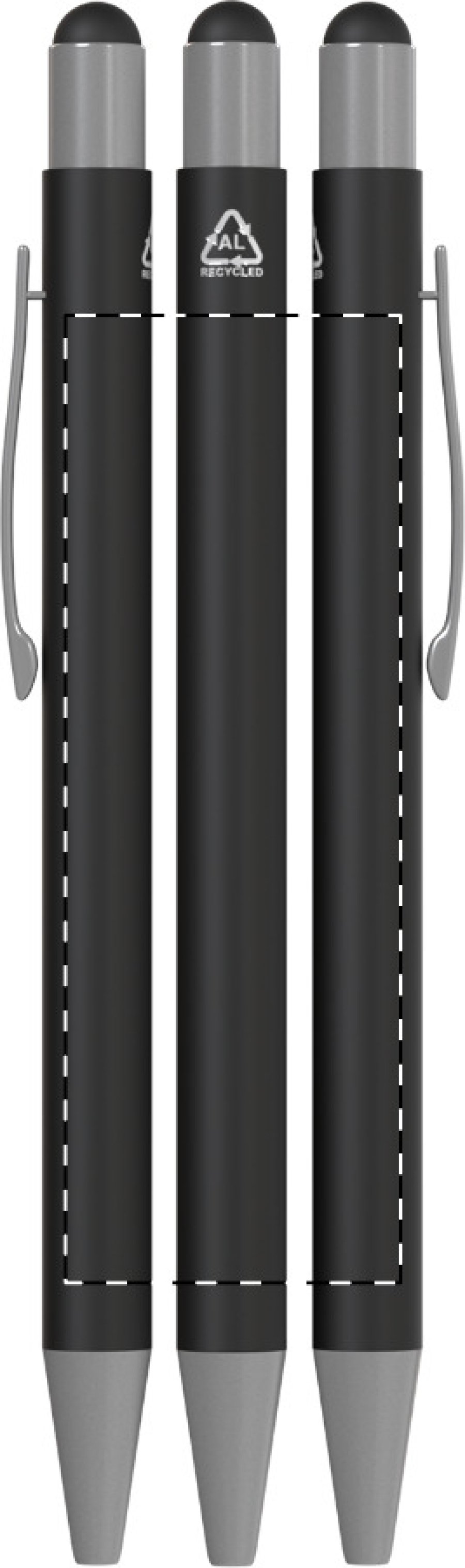 Kuličkové pero a dotykové pero z recyklovaného hliníku s pogumovaným tělem a kovovými částmi. S modrou náplní.
