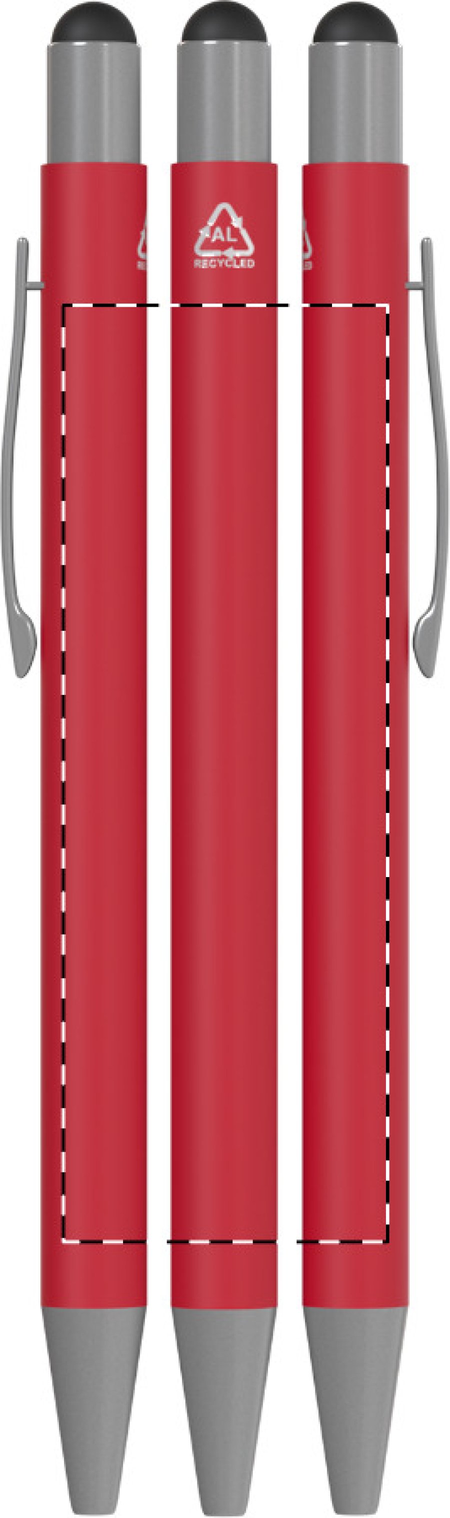 Kuličkové pero a dotykové pero z recyklovaného hliníku s pogumovaným tělem a kovovými částmi. S modrou náplní.