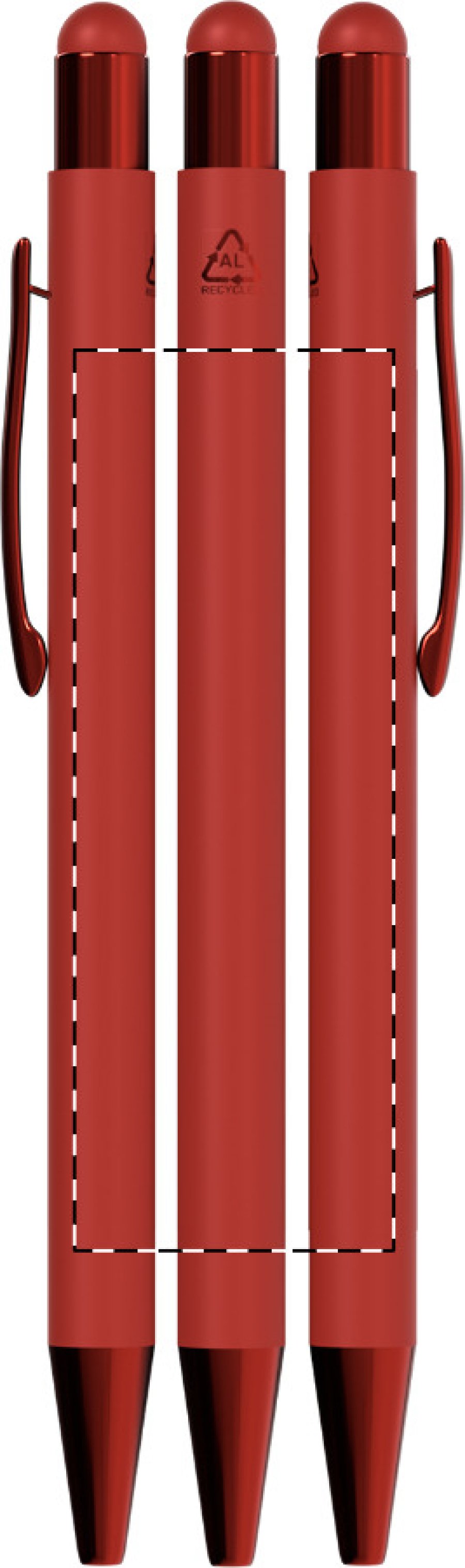 Recyklované hliníkové kuličkové a dotykové pero s pogumovaným tělem a barevnými lesklými kovovými částmi. Se speciální vrstvou pro zrcadlové gravírování odpovídající kovovým částem. S modrou náplní.
