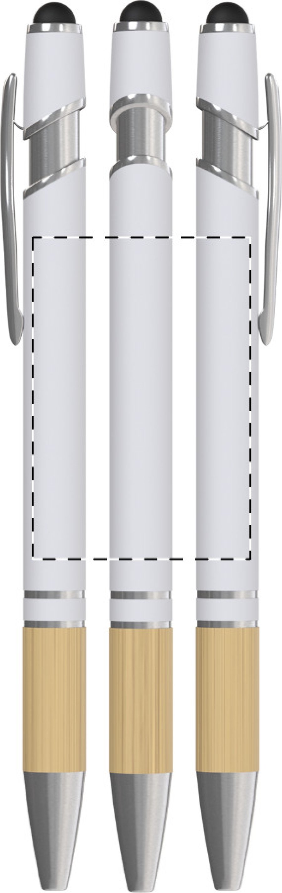 Hliníkové kuličkové a dotykové pero s bambusovým úchopem a pogumovaným povrchem. Se speciální vrstvou pro zrcadlové laserové gravírování. S modrou náplní.