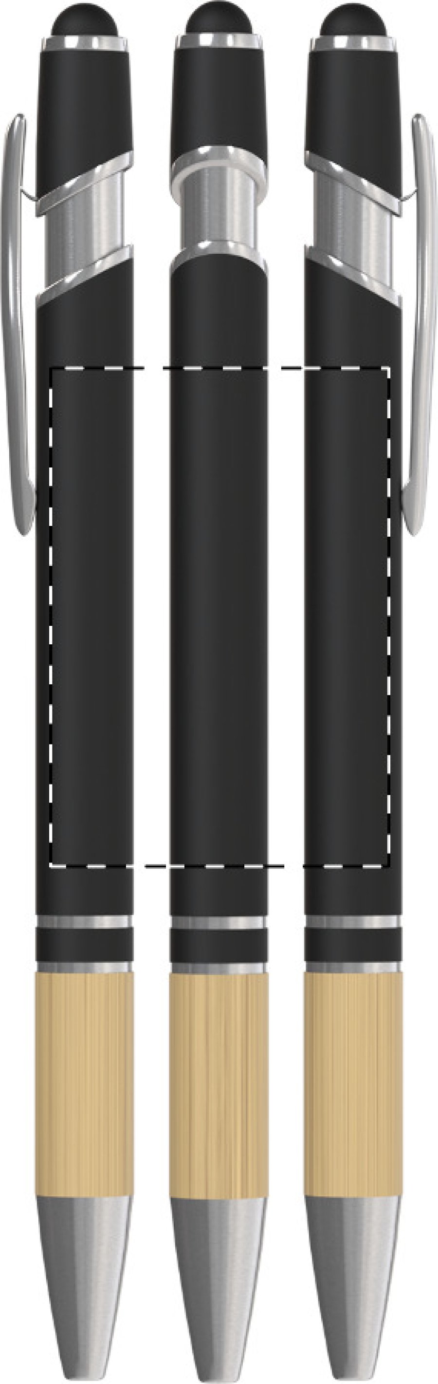 Hliníkové kuličkové a dotykové pero s bambusovým úchopem a pogumovaným povrchem. Se speciální vrstvou pro zrcadlové laserové gravírování. S modrou náplní.