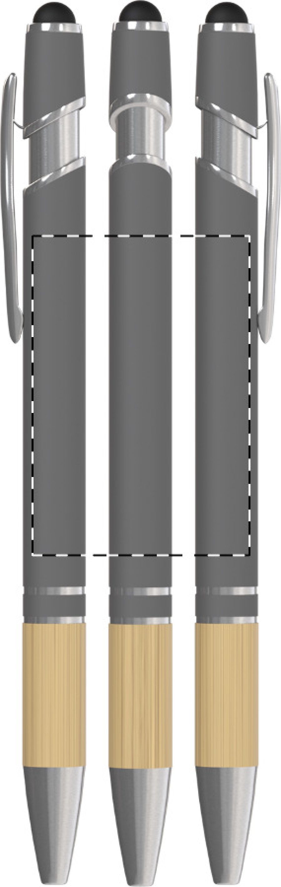 Hliníkové kuličkové a dotykové pero s bambusovým úchopem a pogumovaným povrchem. Se speciální vrstvou pro zrcadlové laserové gravírování. S modrou náplní.