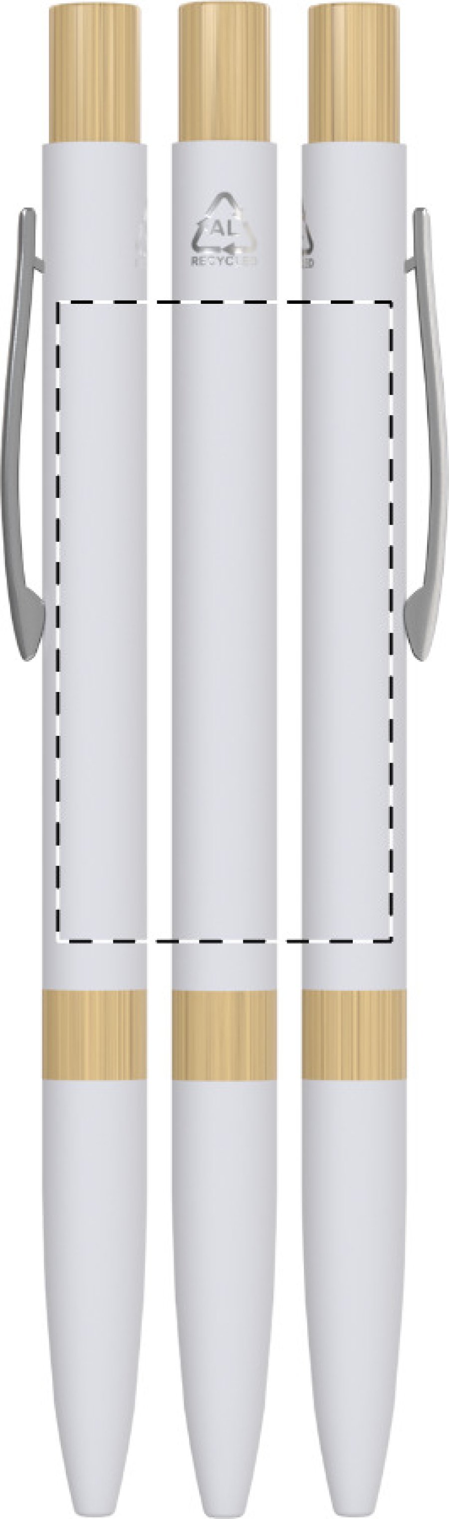 Kuličkové pero z recyklovaného hliníku s bambusovými částmi, pogumovaným povrchem a chromovým klipem. Se speciální vrstvou pro zrcadlové laserové gravírování. S modrou náplní.
