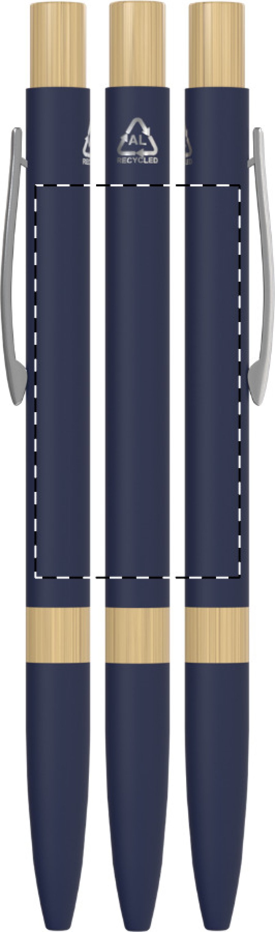 Kuličkové pero z recyklovaného hliníku s bambusovými částmi, pogumovaným povrchem a chromovým klipem. Se speciální vrstvou pro zrcadlové laserové gravírování. S modrou náplní.
