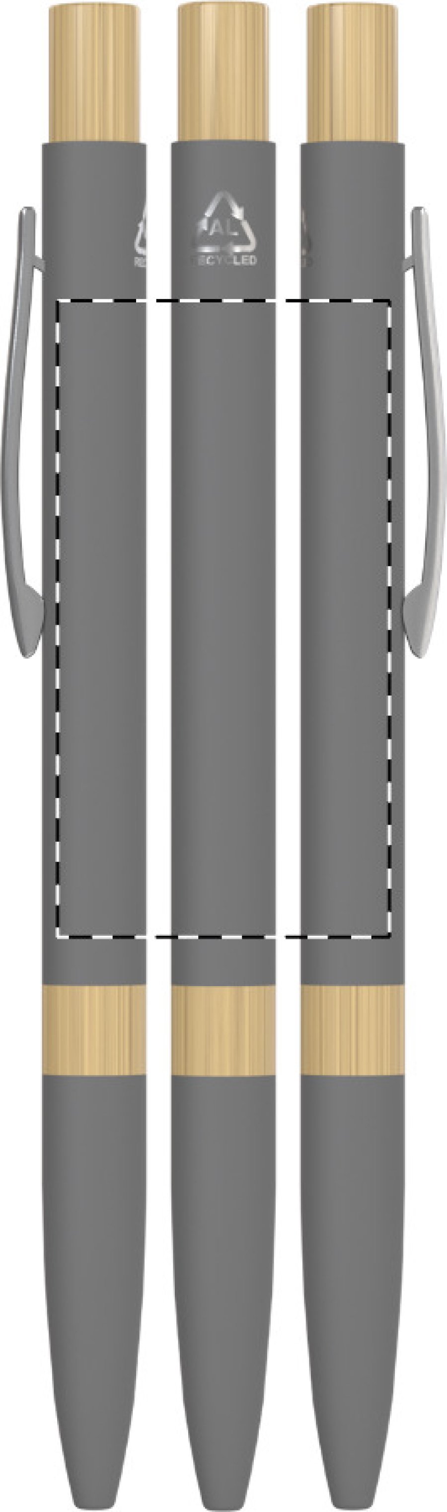 Kuličkové pero z recyklovaného hliníku s bambusovými částmi, pogumovaným povrchem a chromovým klipem. Se speciální vrstvou pro zrcadlové laserové gravírování. S modrou náplní.