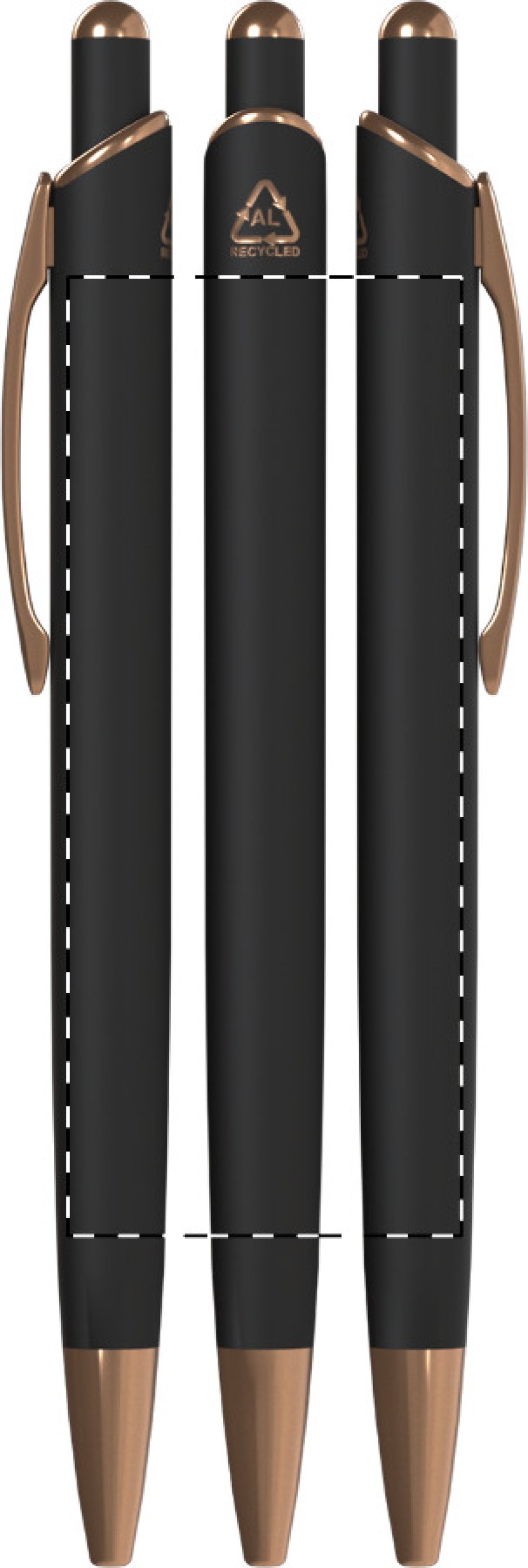 Kuličkové pero z recyklovaného hliníku s pogumovaným povrchem a detaily z růžového zlata. Se speciální povrchovou úpravou pro zrcadlové laserové gravírování v barvě růžového zlata. S modrou náplní.