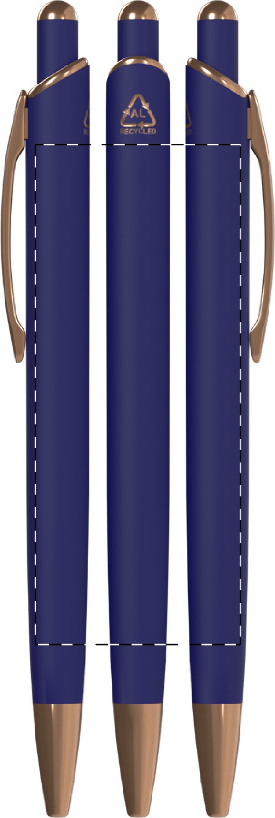 Kuličkové pero z recyklovaného hliníku s pogumovaným povrchem a detaily z růžového zlata. Se speciální povrchovou úpravou pro zrcadlové laserové gravírování v barvě růžového zlata. S modrou náplní.