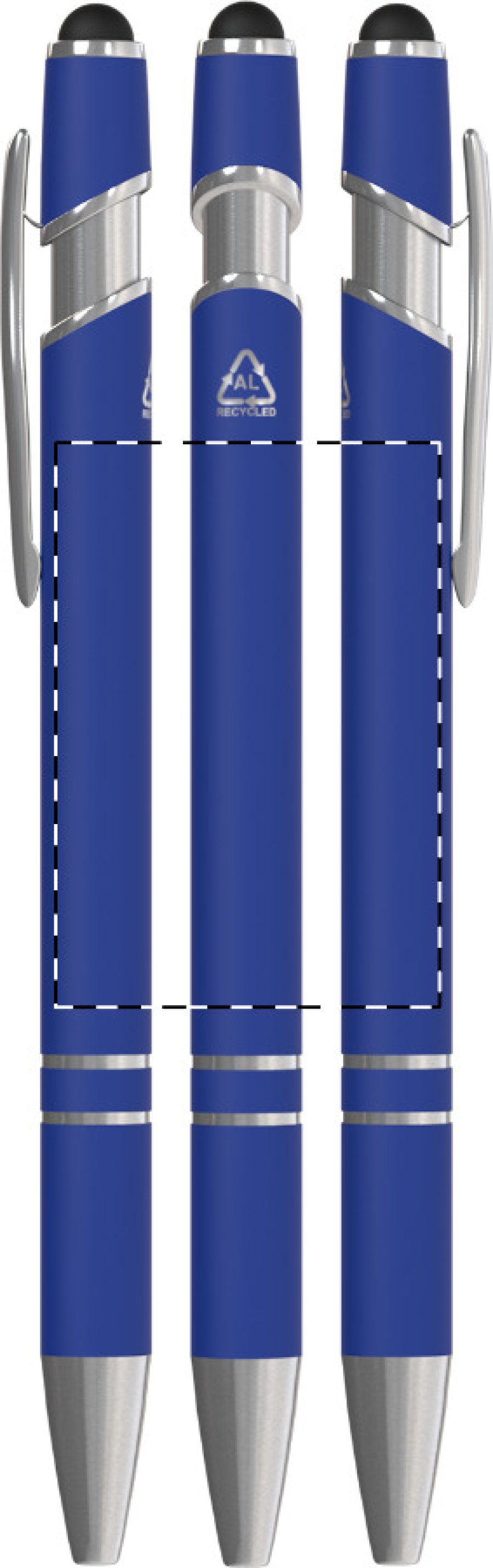 Kuličkové pero a pero pro dotykovou obrazovku z recyklovaného hliníku s pogumovaným tělem a chromovanými detaily. S modrou náplní.