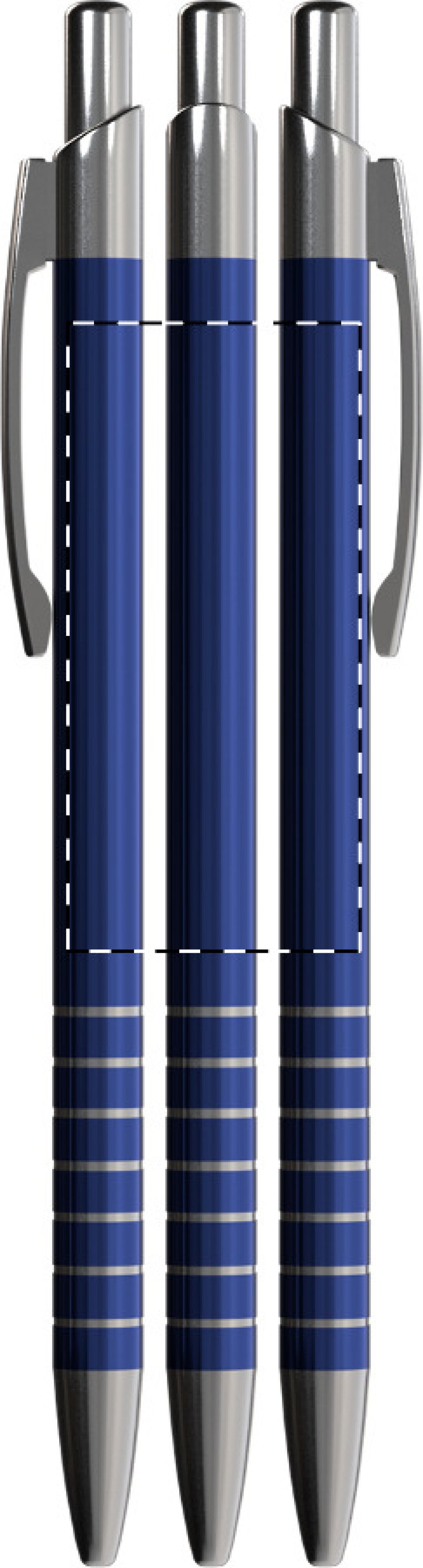 Hliníkové kuličkové pero s kovovým klipem a chromovanou špičkou a vrškem. Do dává se s modrou náplní.