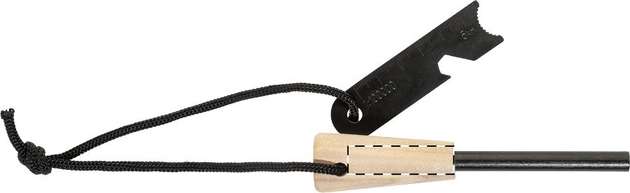 Nářadí na zapalování ohně pro přežití s dřevěnou rukojetí a multifunkční škrabkou z nerezové oceli, vybavené pravítkem, otvírákem na lahve a imbusovým klíčem.