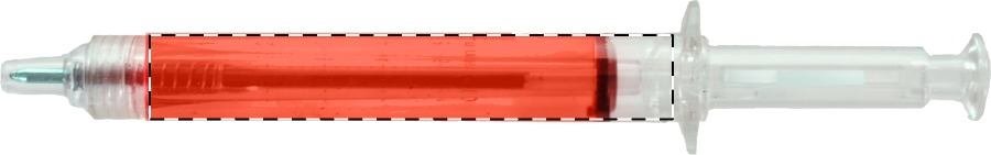 Plastové kuličkové pero ve tvaru injekční stříkačky s průhledným tělem naplněným kapalinou. S modrou náplní.