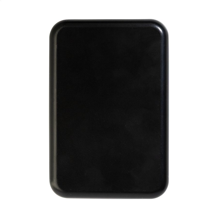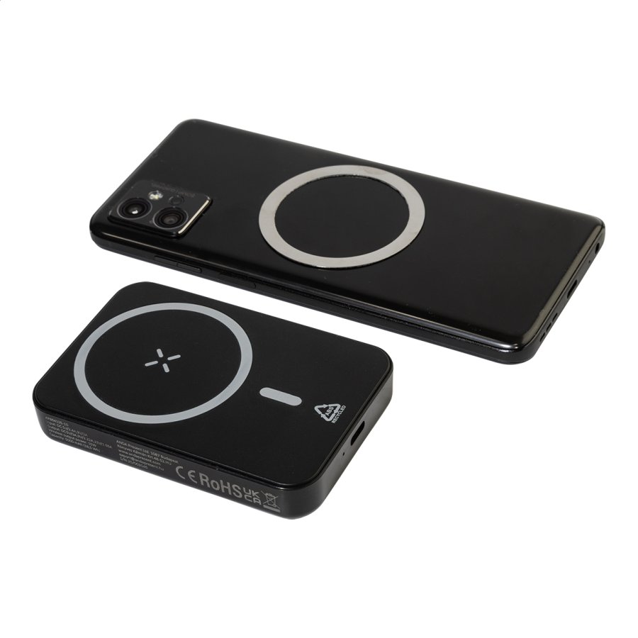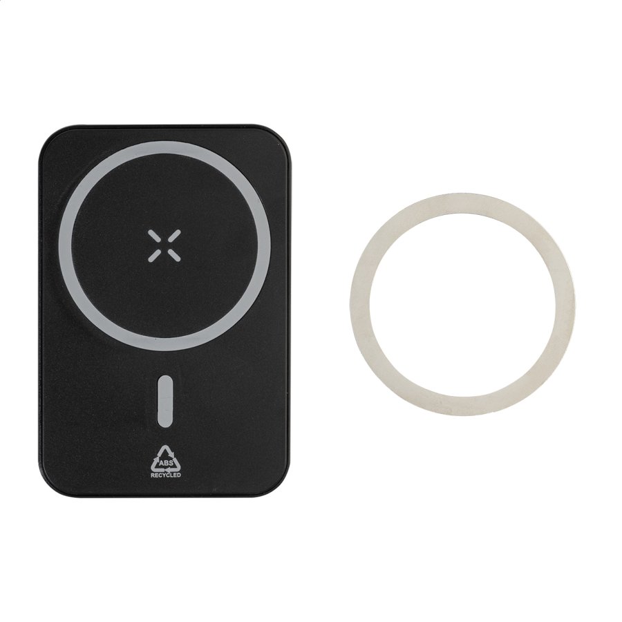 Power banka z recyklovaného ABS s baterií 5000 mAh a vestavěnou magnetickou bezdrátovou rychlonabíječkou (15 W). S USB-C vstupem a nabíjecím portem. Včetně samolepicího kovového kroužku pro použití magnetické funkce na jakémkoli bezdrátově nabíjecím zařízení. Kompatibilní s iPhone® 12 nebo novějším. Včetně nabíjecího kabelu USB.