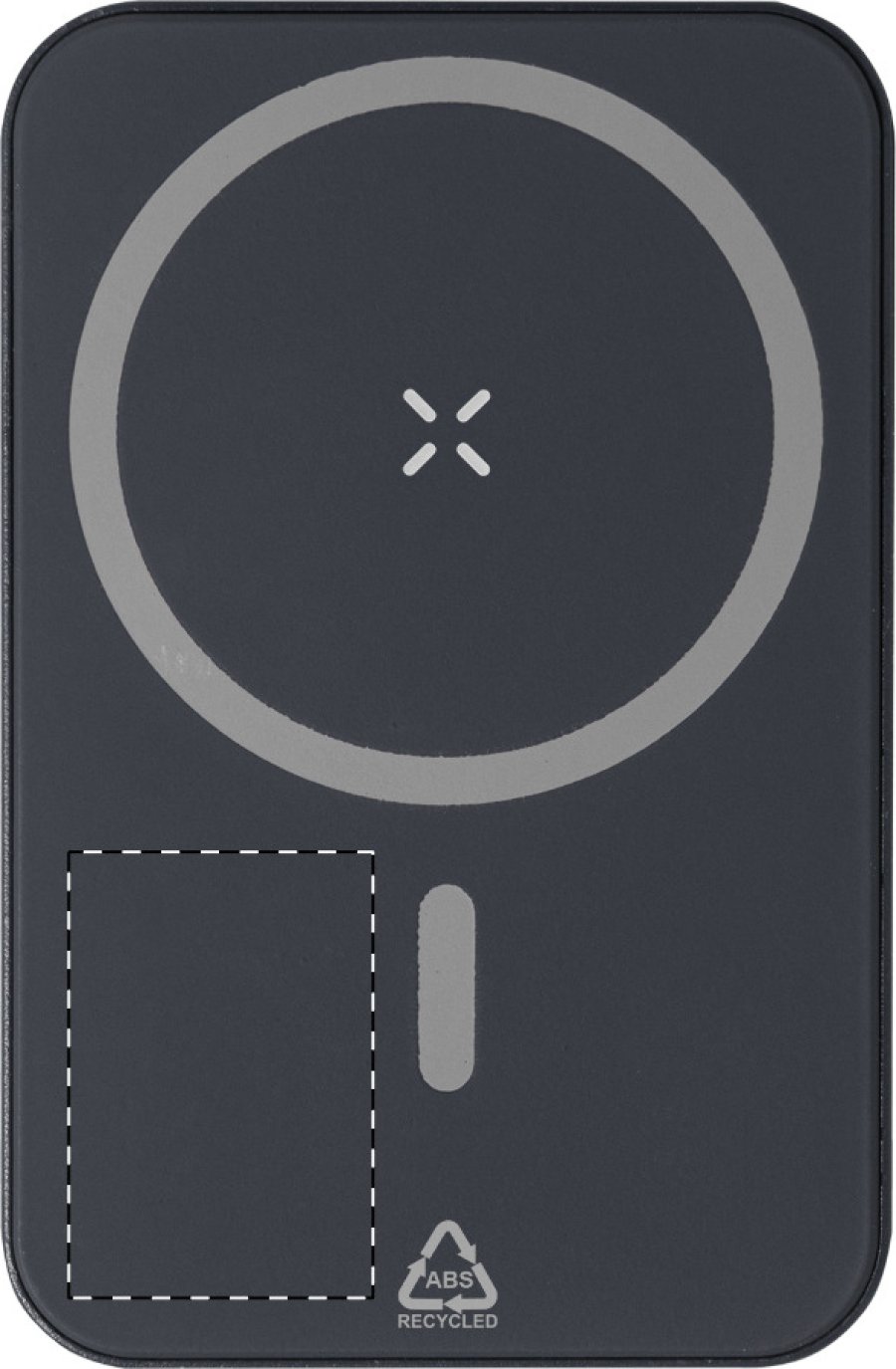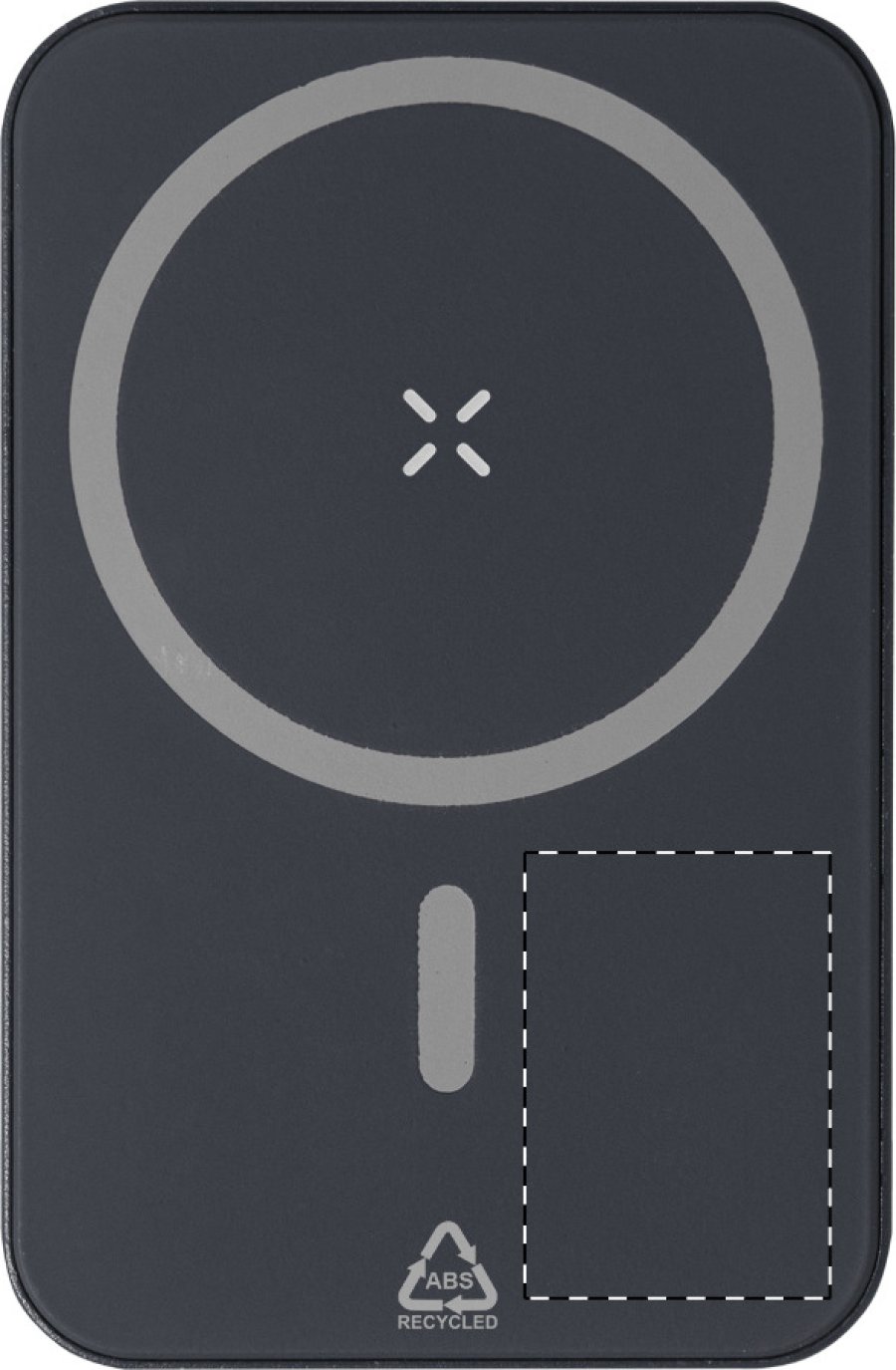 Power banka z recyklovaného ABS s 5000 mAh baterií a vestavěnou magnetickou bezdrátovou nabíječkou (5W). Se vstupem USB-C a portem pro nabíječku. Včetně samolepícího kovového kroužku pro použití magnetické funkce na jakémkoli bezdrátově nabíjecím zařízení. Kompatibilní s iPhone® 12 nebo novějším. Včetně USB nabíjecího kabelu.