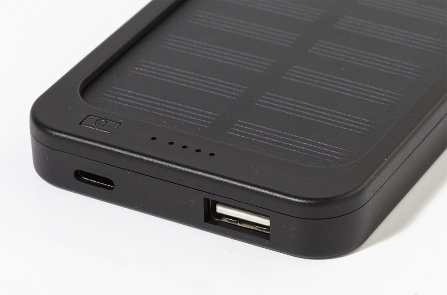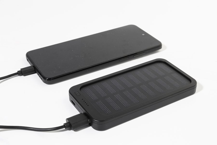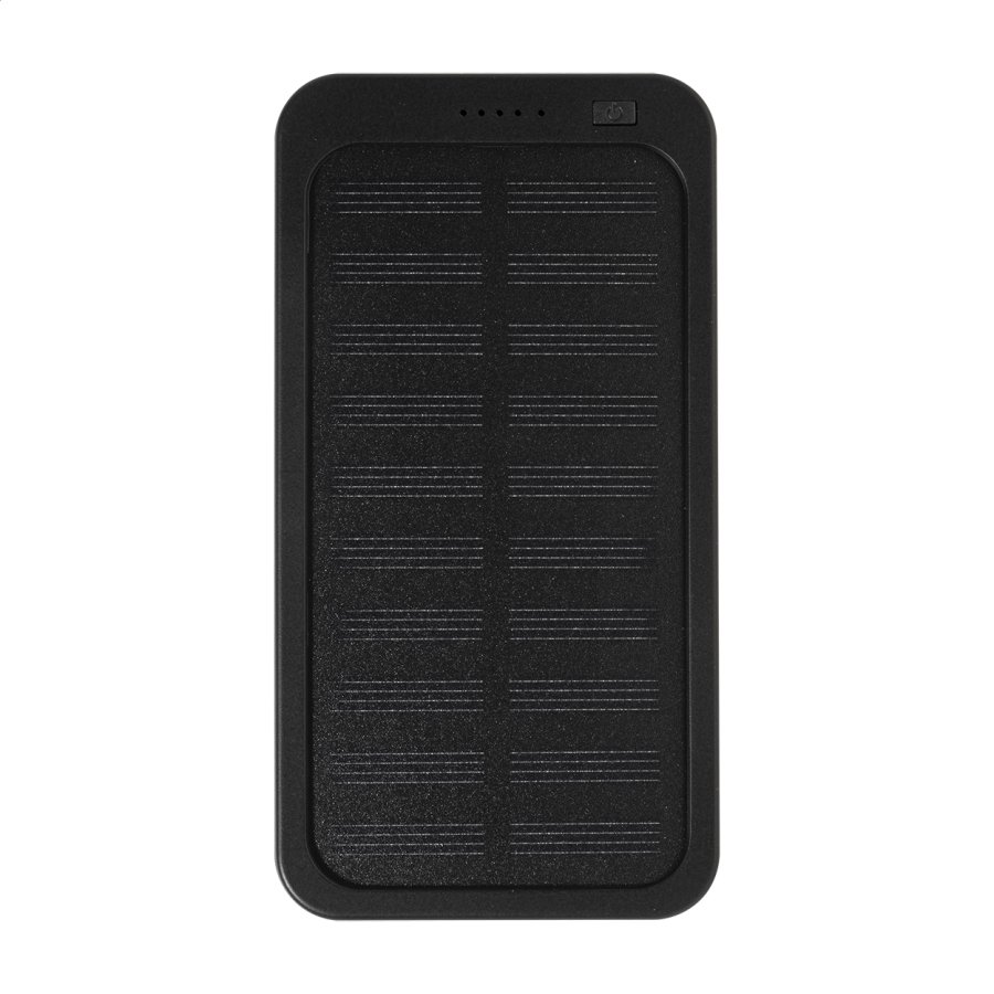 Power banka z recyklovaného ABS plastu s vestavěnou solární nabíječkou a baterií 4000 mAh. S 1 USB a 1 USB-C portem pro nabíjení. Vstupní port USB-C. Včetně nabíjecího kabelu USB.